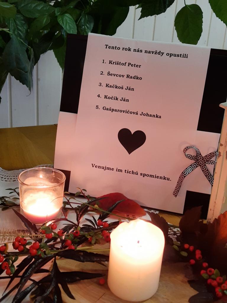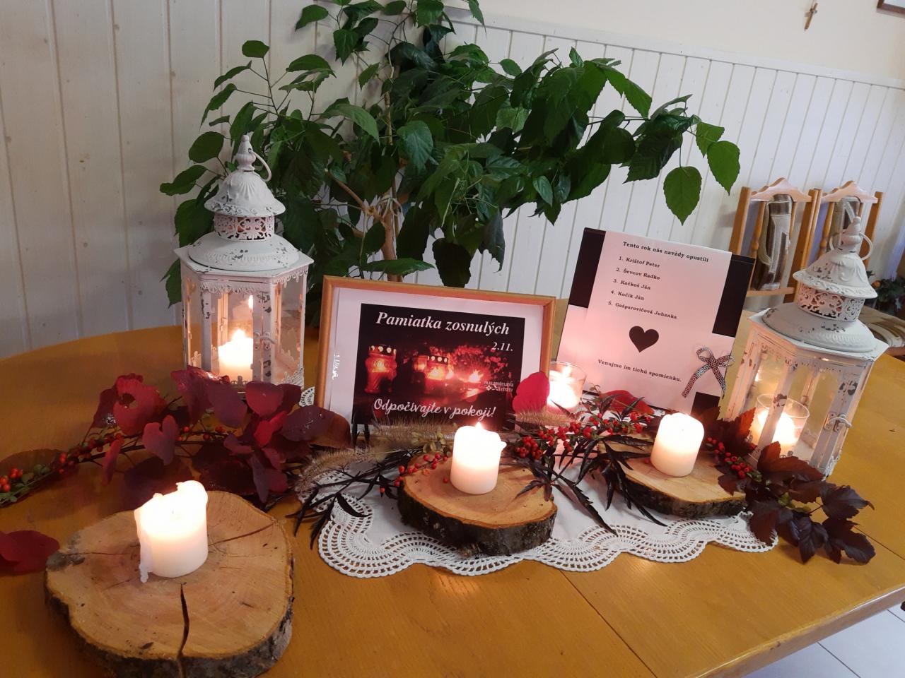 Dňa 2.novembra sme si spoločne s prijímateľmi pripomenuli Pamiatku zosnulých, ľudovo nazývanú dušičky. Pamiatku na zosnulých si každoročne pripomíname viac ako inokedy a navštevujeme spoločne miestny cintorín, na ktorom sú pochovaní aj naši prijímatelia. Tento rok sme pre Covid – 19 nemali možnosť navštíviť hroby zomrelých prijímateľov a príbuzných a tak sme všetkým zomrelým venovali modlitbu a tichú spomienku v našom Centre sociálnych služieb.