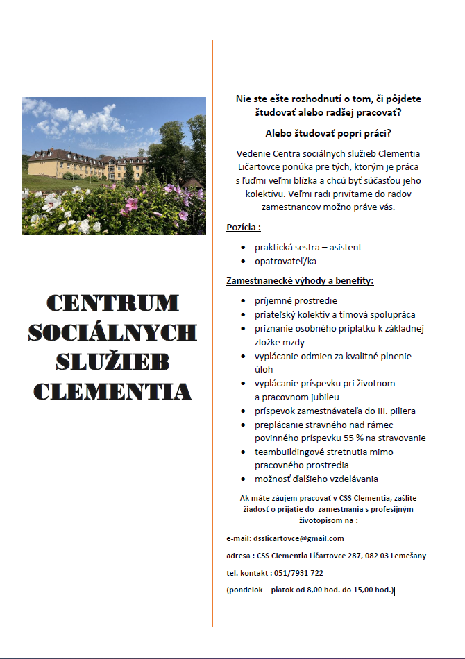 Centrum sociálnych služieb (ďalej len CSS) sa nachádza priamo v obci Ličartovce v malebnom prostredí parkov a záhrady. Účelom zariadenia je poskytovanie komplexnej sociálnej služby v domove sociálnych služieb a v špecializovanom zariadení (pomoc pri odkázanosti na pomoc inej fyzickej osoby, sociálne poradenstvo, sociálna rehabilitácia, ošetrovateľská starostlivosť, ubytovanie, stravovanie, upratovanie, pranie, žehlenie, pracovná terapia, záujmová činnosť).